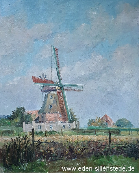 Sillenstede, Mühle, 1950er, 39,6x49,4 cm, Öl auf Leinwand, Privatbesitz (WV-Nr. 1736)